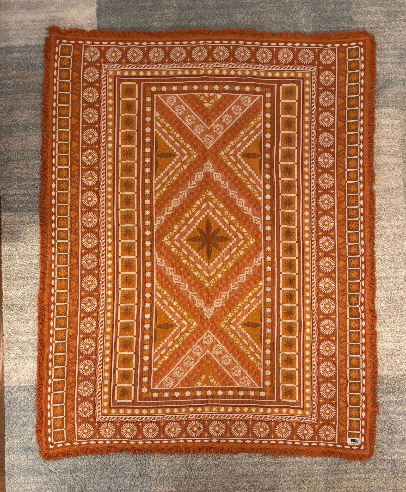Tangerine Dream throw rug has tones of orange throughout, inspired by sunsets and sunrises designed to be used outdoors.